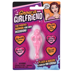 Grow a Girlfriend.  Ever have a need for date but could not get one.  We have the answer with this Grow your own girlfriend.  Just place in water and after a time that stated on package it will grow from its original size.  So it's like having a pocket date right in your, well pocket.  No mess, no fights and no money to spend on birthday presents for them.  So order yours today, just in case.