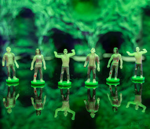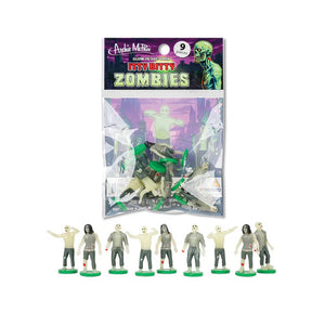 What happens when itty bitty people are bitten by a zombie? Itty Bitty Zombies! These glow-in-the-dark, 1-5/16" (3.3 cm) tall, soft vinyl un-big undead lurkers come in three different styles. Get a bag of Itty Bitty Body Parts to feed them! Illustrated bag of nine Itty Bitty Zombies.