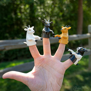 Are these Finger Goats the greatest of all time? It’s possible, and these horned, 2" (5.1 cm) tall, soft vinyl goats would argue that it's true. Put a set on your fingers and your hand will suddenly scream, faint and consider eating a tin can when it’s hungry. Four different colors.